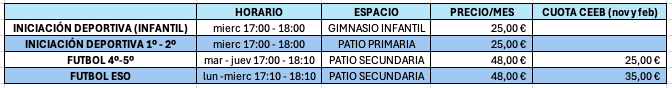 Fútbol sala: El fútbol sala es otra de nuestras actividades destacadas. Los estudiantes podrán disfrutar de emocionantes partidos y entrenamientos centrados en la técnica individual, el juego en equipo y la estrategia. A partir de 3º de primaria, los alumnos participantes podrán competir en una competición anual organizada por el CEEB. Los entrenadores fomentarán el desarrollo de habilidades específicas del fútbol sala, así como los valores deportivos.